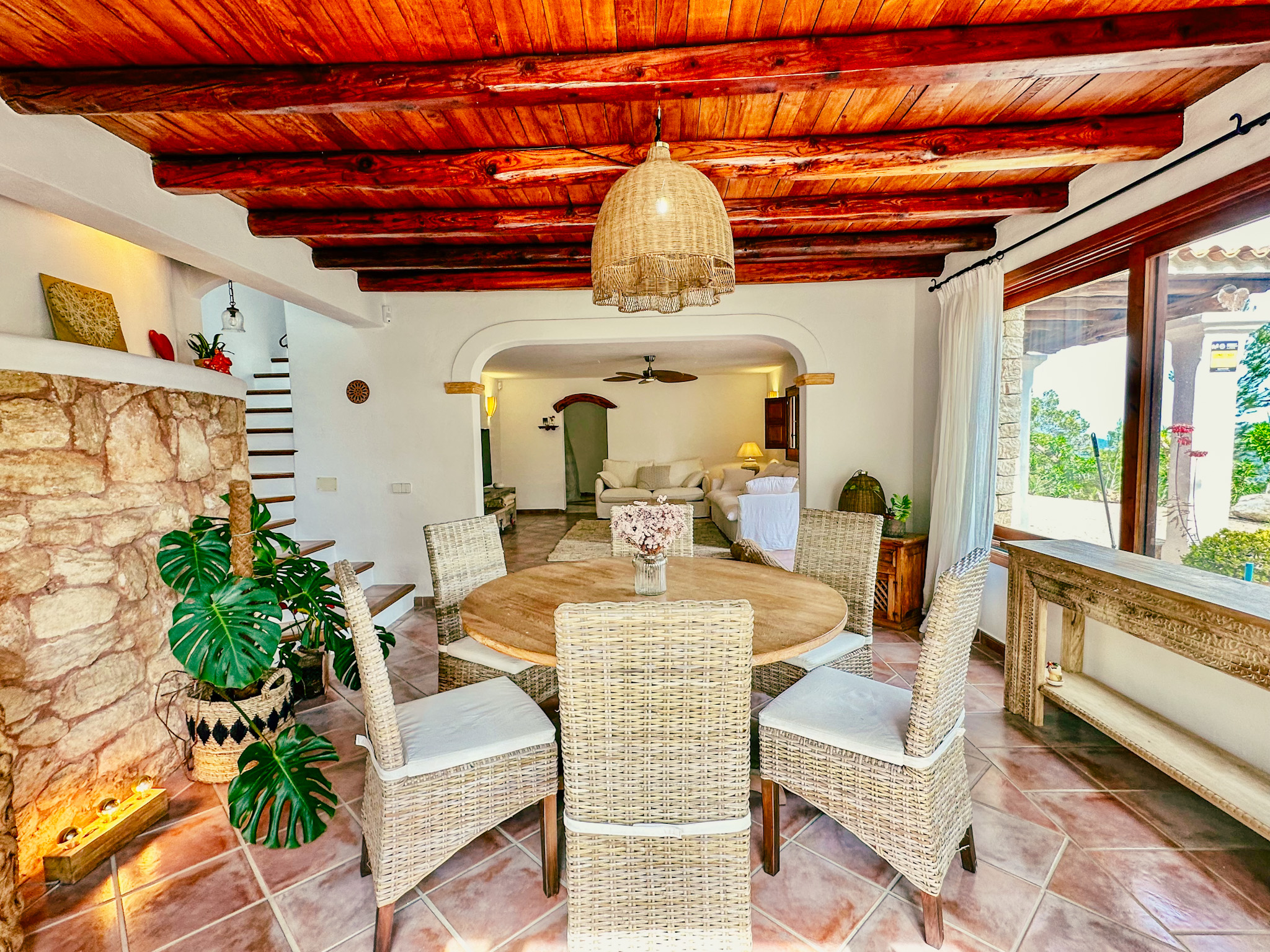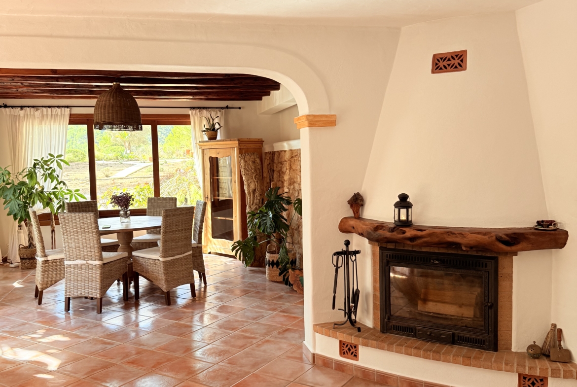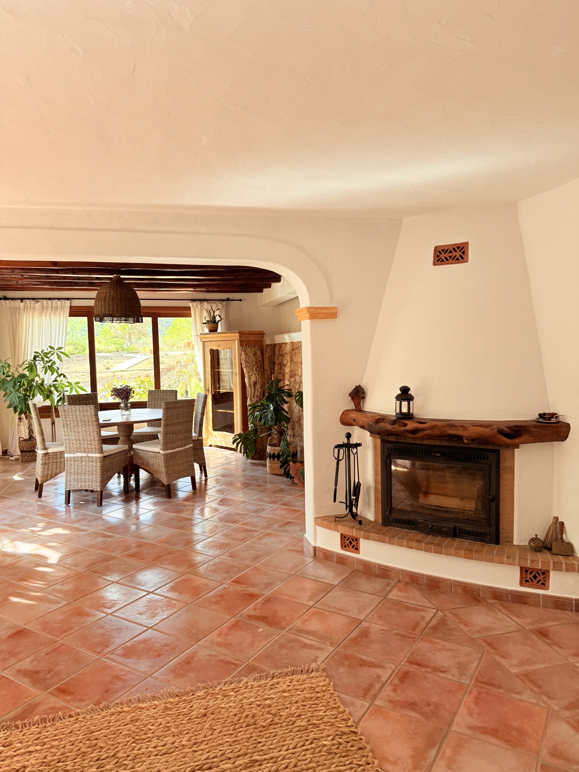 The property features 3 spacious bedrooms and 2 bathrooms, perfectly suited for families, couples, or those seeking a serene work-from-home base on the island. Inside, the open-plan reception and dining room is filled with rustic charm, showcasing traditional finca details, whitewashed walls, exposed stone, wooden shutters, and Sabina beams that reflect timeless Ibicencan style.