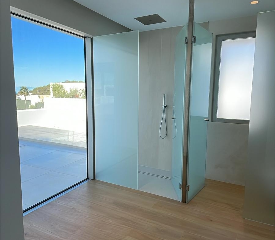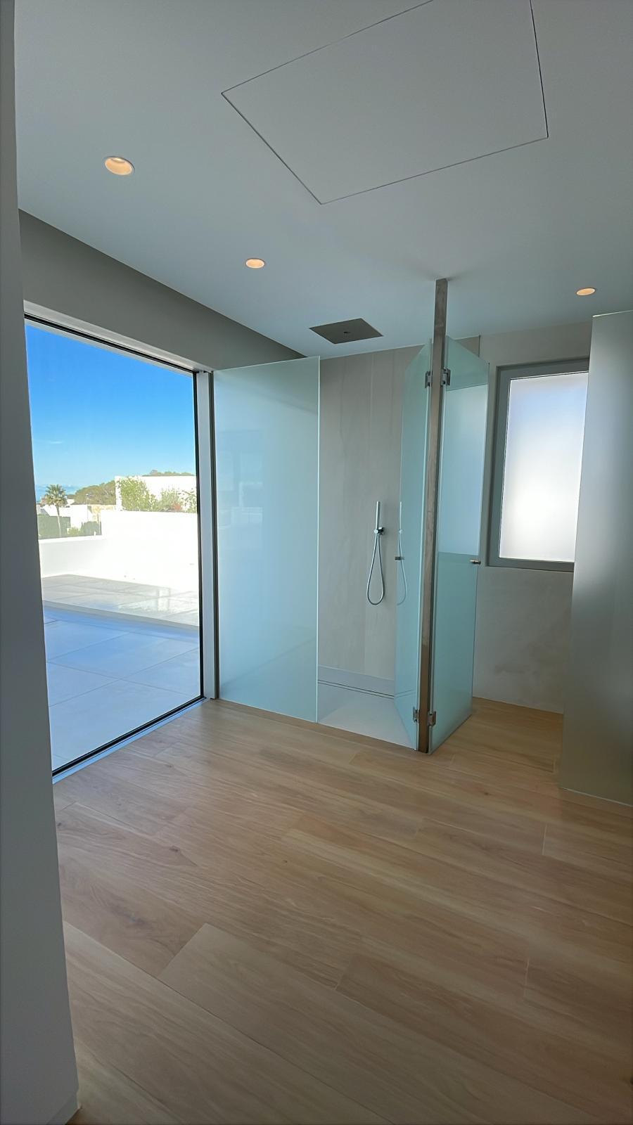 Designed for both relaxation and entertainment, the outdoor areas include a striking infinity swimming pool, a fully fenced private garden, and seamless indoor-outdoor living spaces. Inside, the villa continues to impress with a private cinema room, garage, state-of-the-art aerothermal heating, and air conditioning throughout, delivering year-round luxury and efficiency.